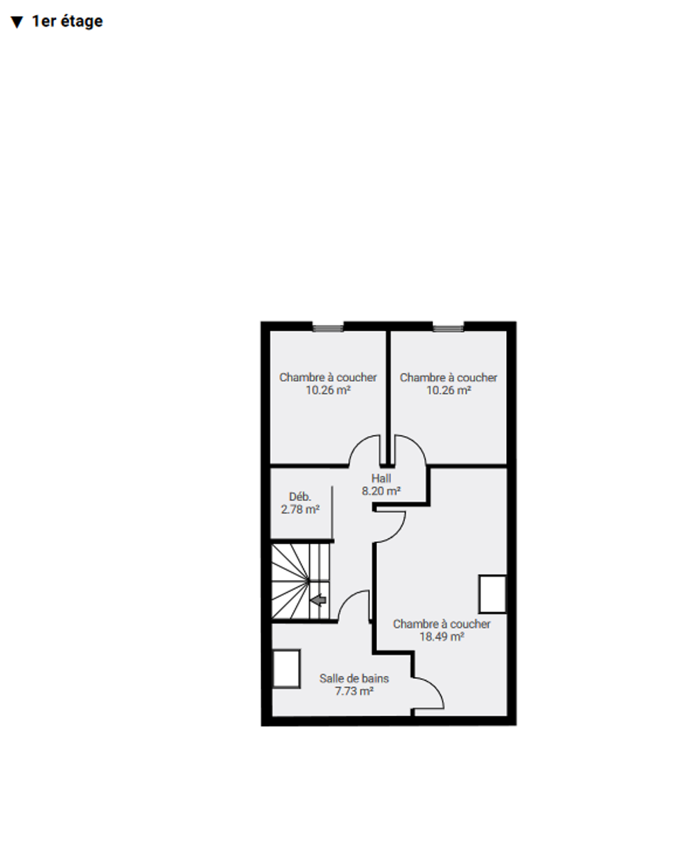 1er étage : un hall de nuit, 3 chambres, une salle de bains avec douche, bain et WC, un débarras.
